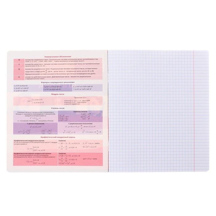 Тетрадь предметная формата А5+ (170х203 мм). Обложка из высококачественного мелованного картона плотностью 170 г/м2. В блоке 36 листов в клетку с полями. Бумага офсетная плотностью 60 г/м2. Белизна бумаги - 100%. Цвет линовки - синий. Скругленные уголки обложки и блока. Тип скрепления - скоба. Имеет инфо-блок с кратким изложением школьной программы. Тетради упакованы в термоусадочную плёнку по 5 штук.