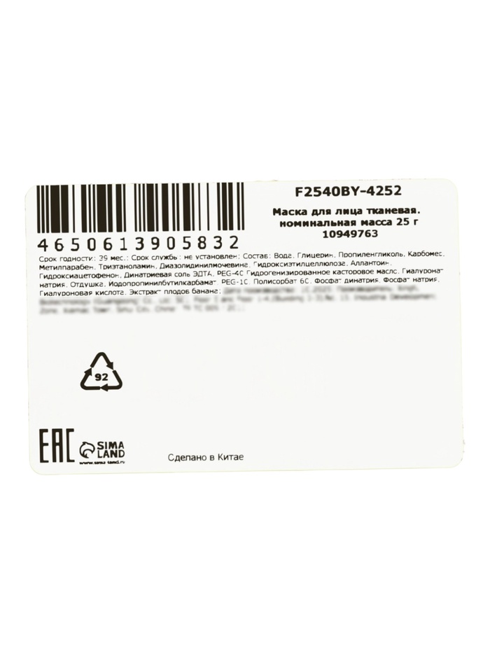 - Лёгкая текстура: тканевая маска плотно прилегает к лицу, обеспечивая равномерное распределение полезных веществ.