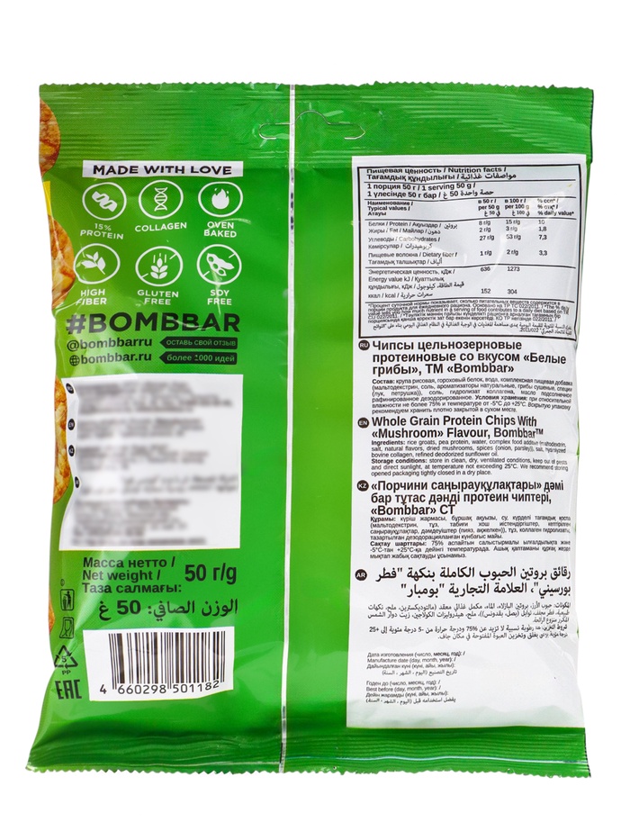 ТМ BOMBBAR Чипсы цельнозерновые протеиновые со вкусом "Белые грибы" 50 г