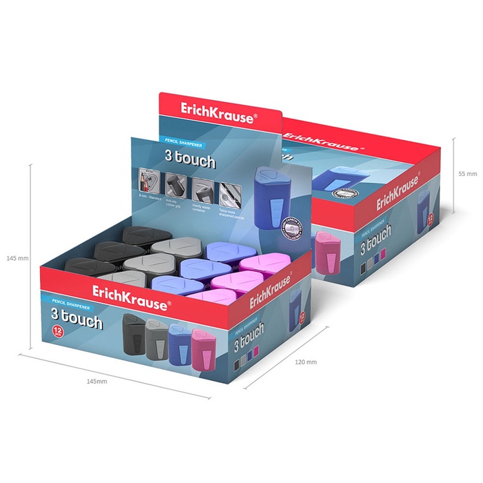 Пластиковая точилка с ёмким контейнером для сбора стружки и противоскользящими резиновыми вставками на гранях корпуса. Контейнер оснащен дополнительной крышкой, предотвращающей высыпание сожержимого. Имеет отверстие диаметром 8 мм для заточки стандартных чернографитных и цветных карандашей. Высококачественное никелированное брендированное лезвие из углеродистой стали гарантирует высокую производительность.