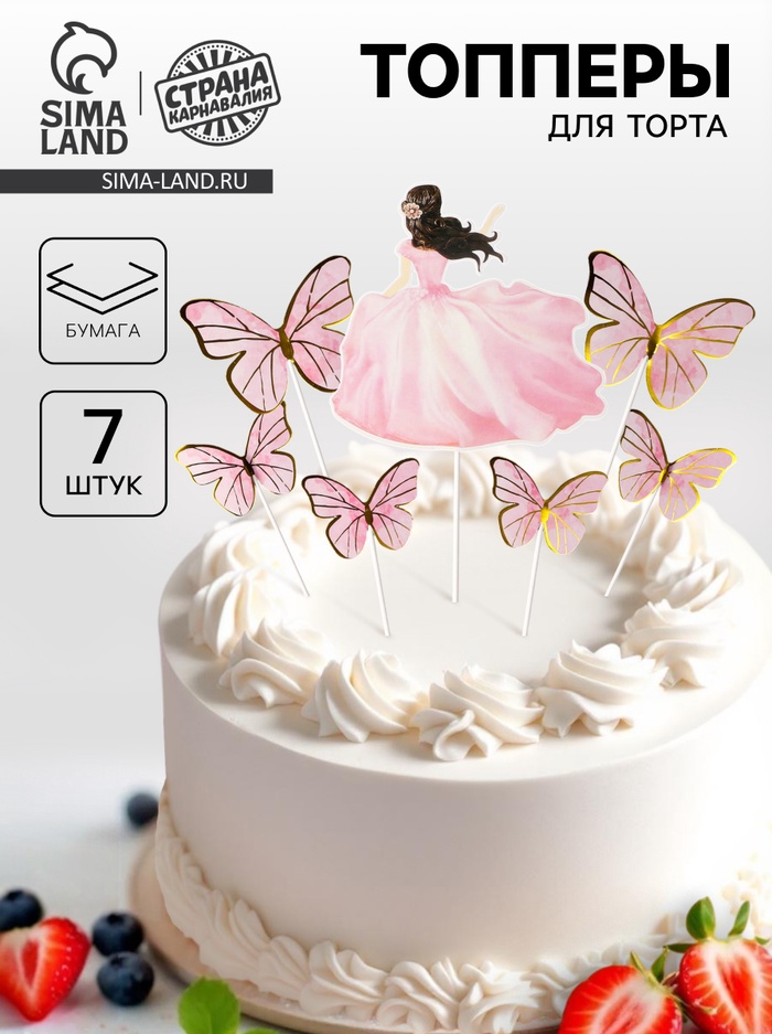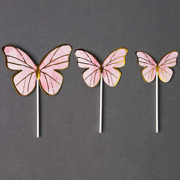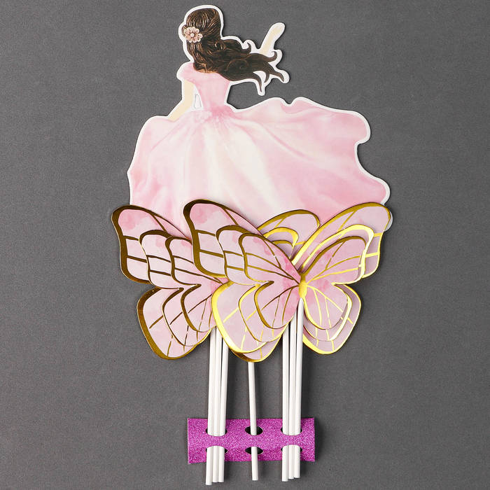 Высота держателей — 12 см и 21 см, это позволяет размещать топперы на тортах разного размера. Розовый цвет и нежный дизайн с бабочками создают атмосферу лёгкости и романтики.