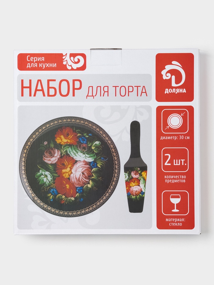 - Набор из двух предметов: стеклянная тортовница и лопатка гармонично дополняют друг друга.