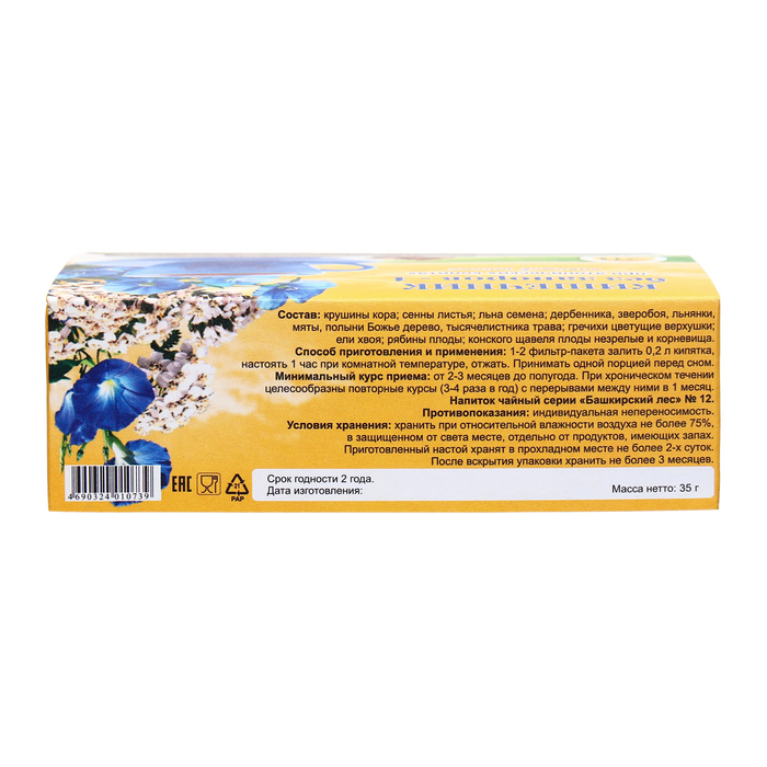 Состав: володушки, горца, дербенника, зверобоя, золотарника, мяты, первоцвета, полыни Божье дерево, тысячелистника, чабреца трава, гречихи цветущие верхушки, ели хвоя, крушины кора, льна семена, рябины плоды, сенны листья.
