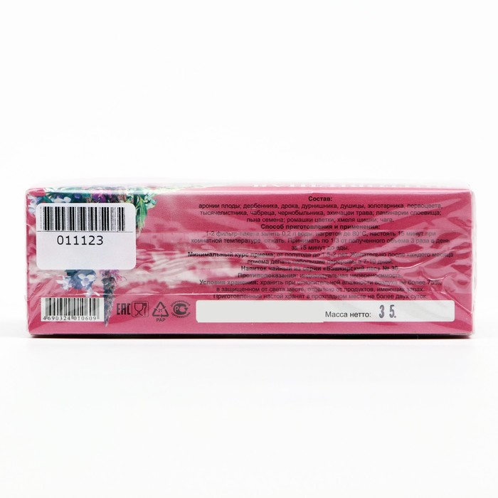 Состав: аронии, рябины плоды; березы листья; дербенника, донника, дурнишника, душицы, зверобоя, золотарника, зопника, зюзника, крапивы, люцерны, медуницы, первоцвета, подмаренника, полыни Божье дерево, пустырника, синеголовника, таволги, тысячелистника, цикория, чабреца, чернобыльника, эхинацеи трава; гречихи цветущие верхушки; ели, сосны хвоя; ивы кора; ламинарии слоевища; льна семена; чага.