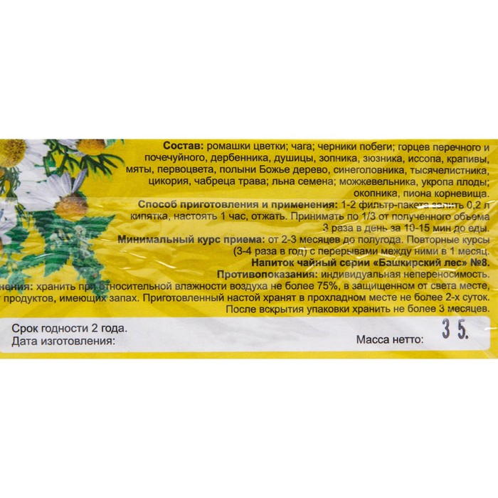 Состав: гречихи цветущие верхушки, дербенника, душицы, зопника, зюзника, крапивы, мяты, первоцвета, полыни Божье дерево, синеголовника, тысячелистника, цикория, чабреца трава, льна семена, можжевельника, укропа плоды, окопника, пиона корни, ромашки цветки, чага, черники побеги.