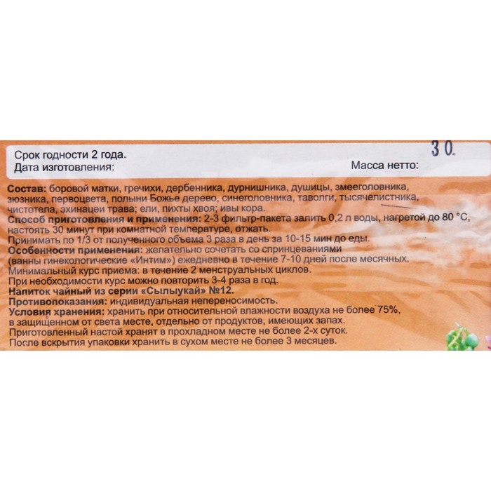 Условия хранения: хранить при относительной влажности воздуха не более 75%, в защищенном от света месте, отдельно от продуктов, имеющих запах. Приготовленный настой хранят в прохладном месте не более 2-х суток. После вскрытия упаковки хранить в сухом месте не более 3 месяцев.