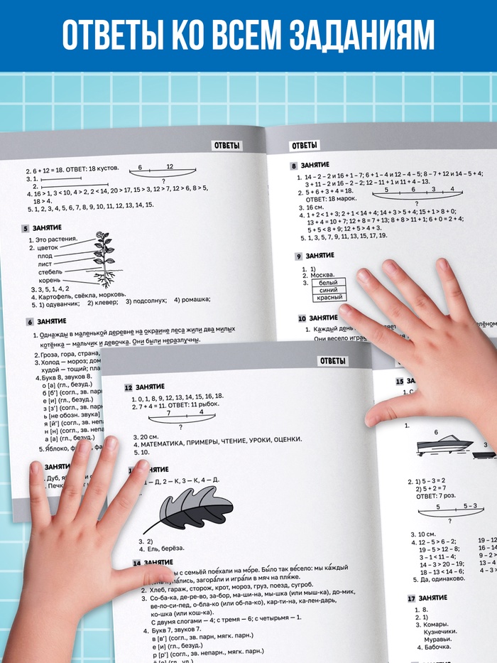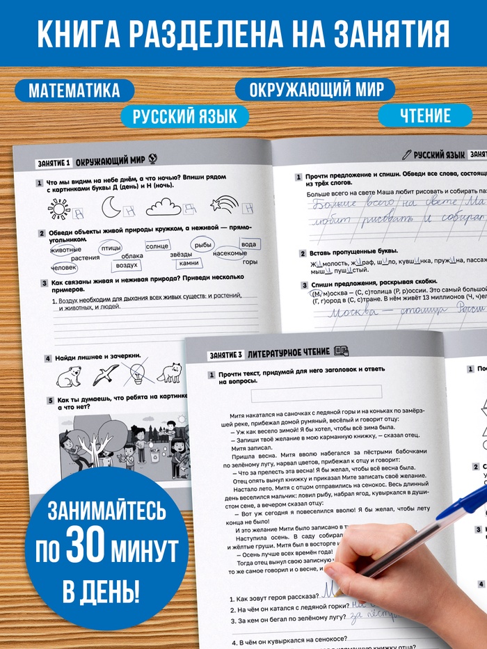 - 100 страниц с разнообразными заданиями, разделёнными по предметам: математика, русский язык, окружающий мир, чтение.