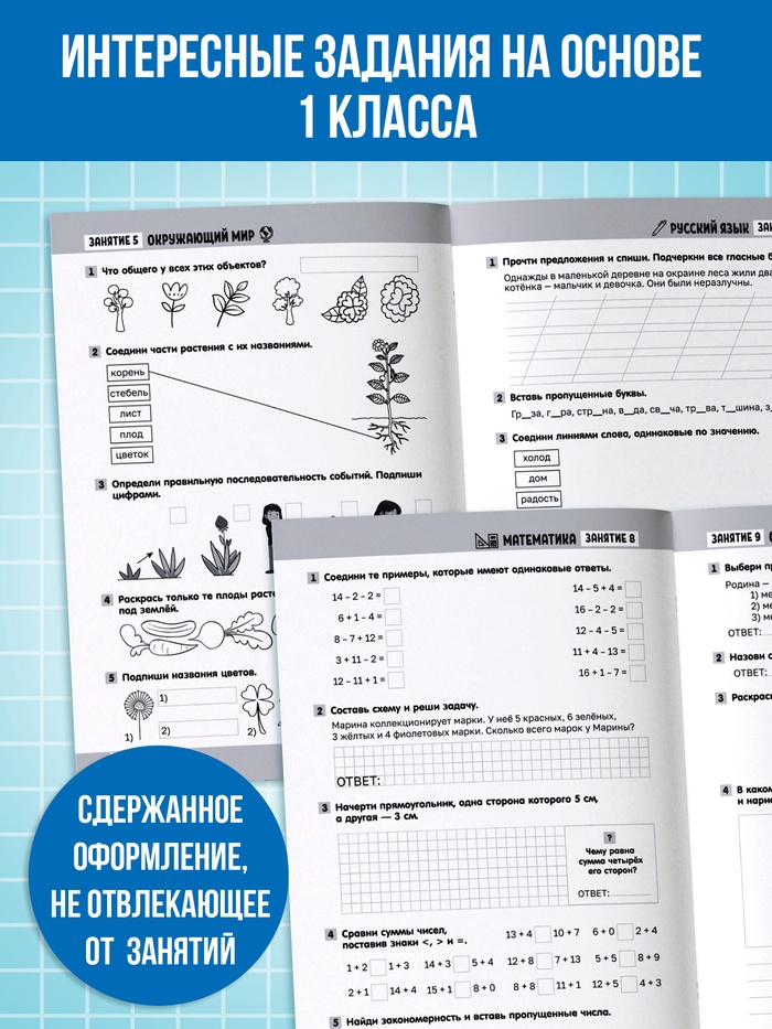 - Задания охватывают ключевые темы программы 1 класса: буквы, слова, счёт, логику и основы окружающего мира.