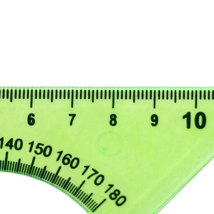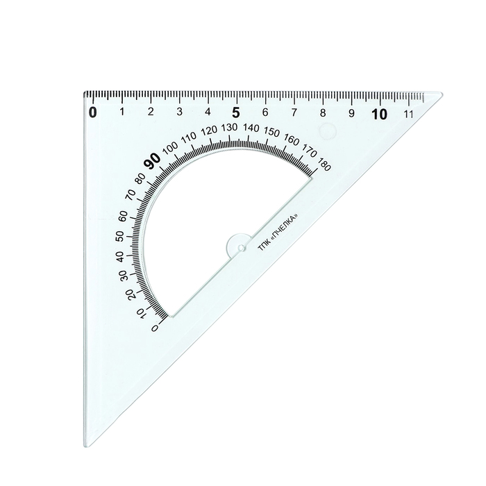 Изготовлен из прочного прозрачного пластика толщиной 2 мм. Длина шкалы - 12 см, угол - 45°, транспортир - 180°. обладает четкой разметкой, что делает его удобным в использовании. Упакован в блистер с европодвесом.