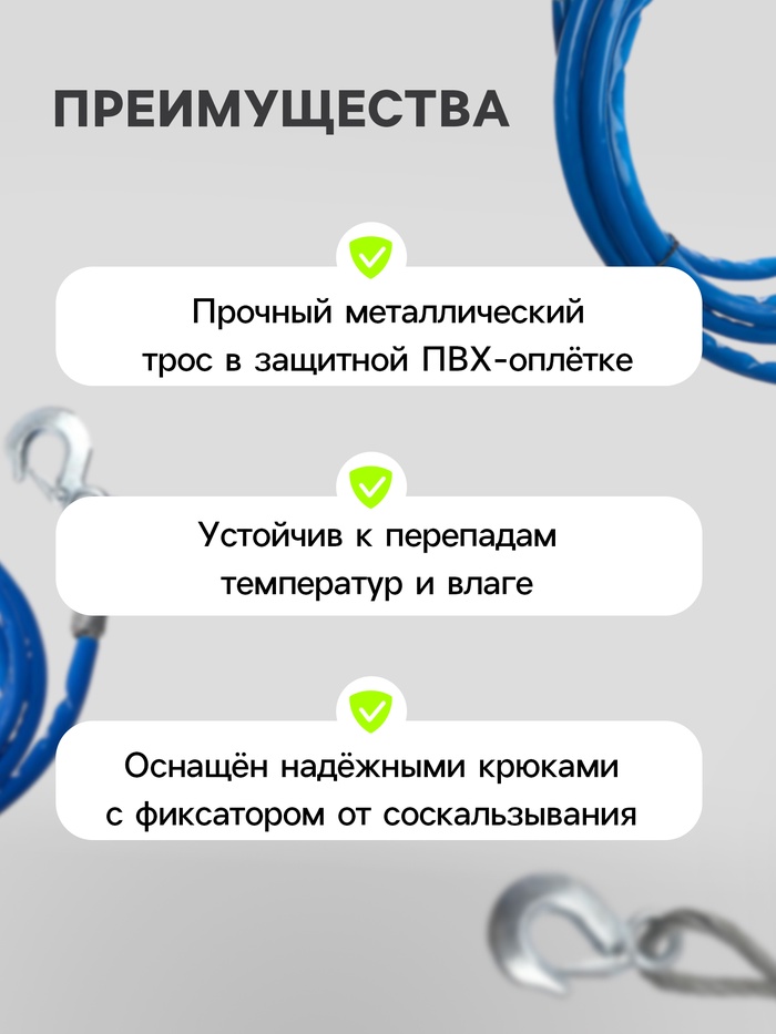 Буксировочный трос TORSO – неотъемлемая часть дополнительного оснащения любого автомобиля. Служит для буксирования неисправного автомобиля. Изделие является прочным и крепким, поскольку выполнено из переплетенной высококачественной стальной проволоки. Даже если вы никогда раньше не попадали машиной в серьезный сугроб, то лучше обзавестись тросом и хранить его в багажнике, чем искать выход из экстремальной ситуации.