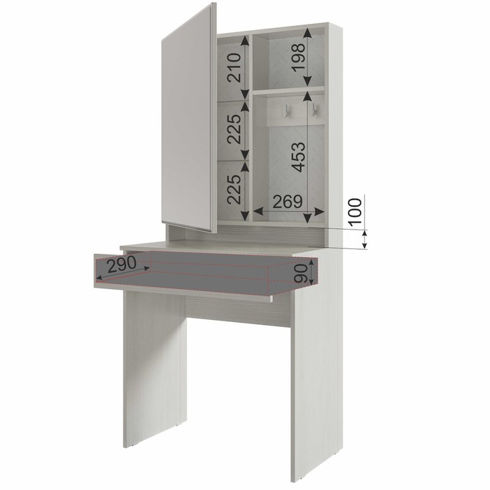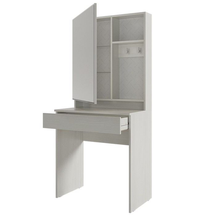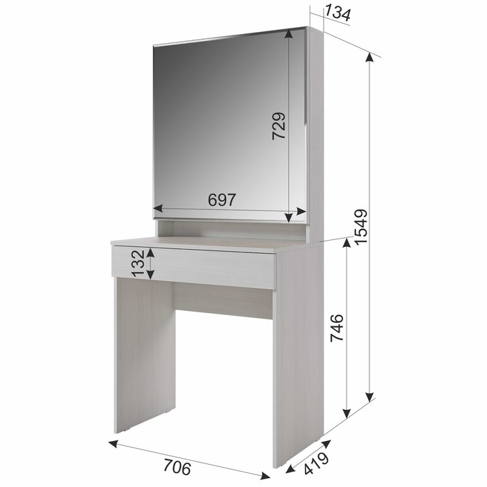 Трюмо Аурика – это компактное и стильное трюмо хорошо впишется в спальню, прихожую и даже детскую. В широком зеркале на фасаде можно увидеть свое прекрасное отражение, а за зеркальным фасадом разместить все необходимые вещи. Стеклянные полочки всегда легко протереть в случае загрязнений. На пластиковые крючки повесить любимые украшения и даже фен. Кромка зеркала по периметру обработана фацетом, благодаря такой обработке, изделие преображает пространство комнаты. Грани зеркала красиво преломляют свет и блестят на солнце. Под столешницей находится большой выдвижной ящик на шариковых направляющих, в котором разместятся много важных вещей.