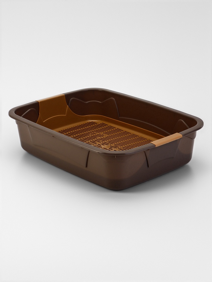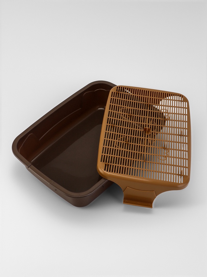 - Функциональная система: Съёмная сетка на высоте 1,5 см создаёт барьер между свежим наполнителем и отходами. Кошка ходит по сетке, а загрязнения остаются внизу — это снижает запахи и экономит расход наполнителя.