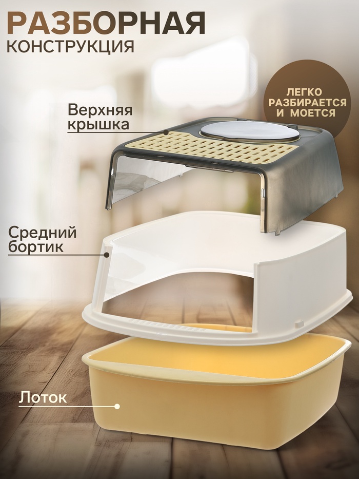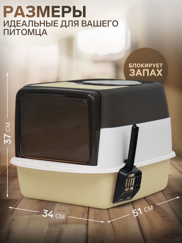 - Эргономичный дизайн: закрытая конструкция предотвращает рассыпание наполнителя и обеспечивает приватность для вашего питомца.