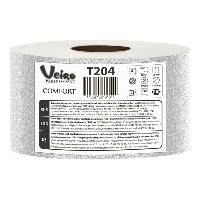 Туалетная бумага для диспенсеров Veiro Professional Comfort T204 в средних рулонах, 2 слоя, 170 метров (1360 листов)