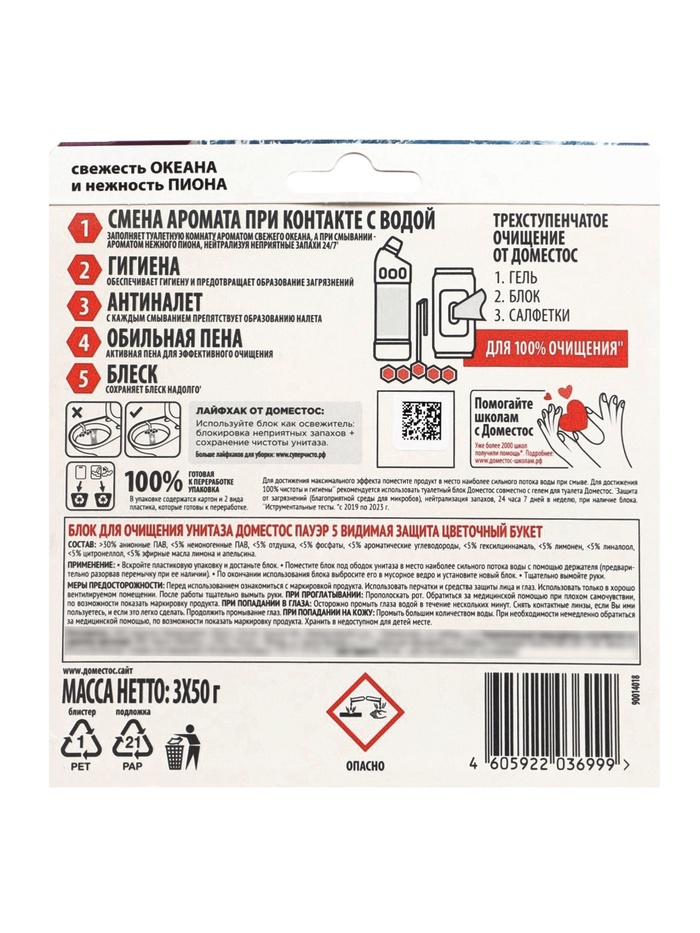 Туалетные блоки для очищения унитаза ДОМЕСТОС свежесть океана и нежность пиона, 3 шт по 50 г 1099863