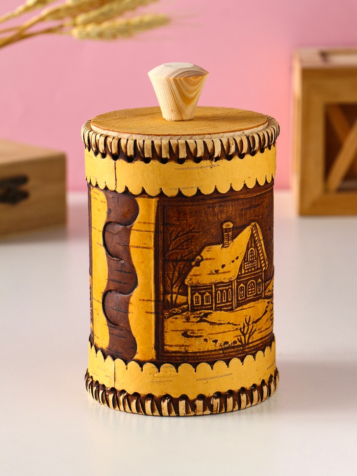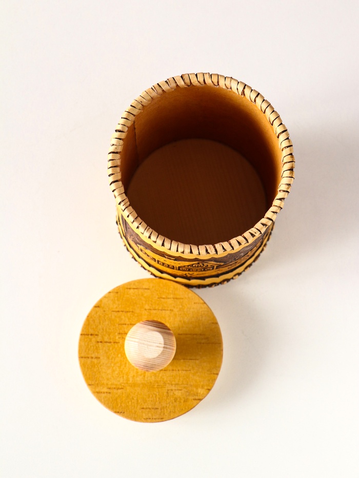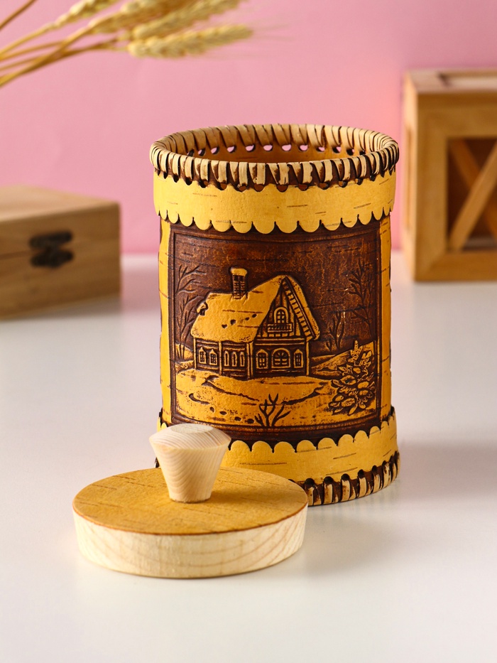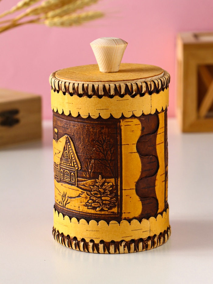 Туес шитый "Домики", D8смхH(с хватком)14см, береста