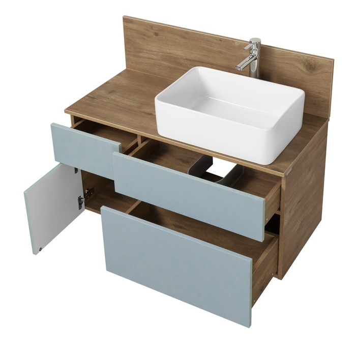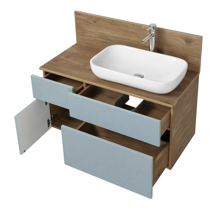 Тумба Мишель 100 очень вместительная и функциональная: слева располагается небольшой выдвижной ящик, идеально подходящий для хранения мелочей, под которым находится отделение со створкой, а справа у тумбы расположены два вместительных ящика полного выдвижения, снабженных доводчиками. Все элементы оснащены системой открывания push-to-open.
