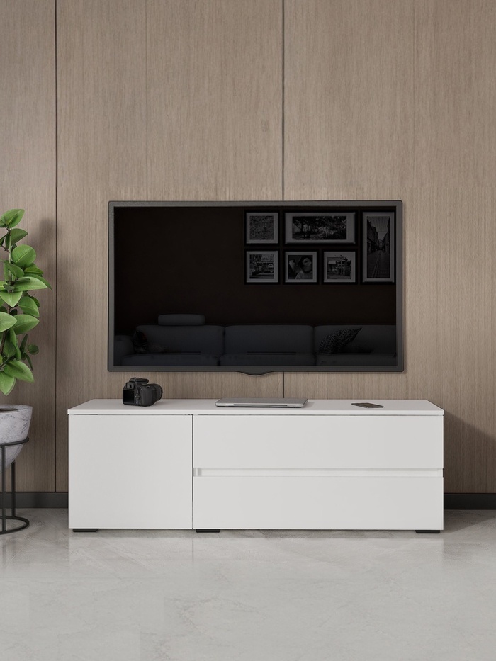 - Просторные ящики: два вместительных выдвижных ящика и ниша с дверцой, обеспечат хранение дисков, пультов дистанционного управления и других мелких бытовых приборов.