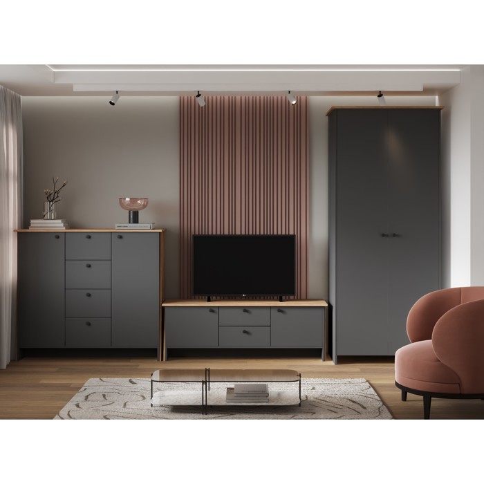 Тумба под ТВ Теодора – эта мебель, обладающая большим вместительным пространством, создавая современный интерьер в вашей гостиной. Качественные материалы, обеспечивают долгий срок службы, комфорт и практичность для удобного хранения личных вещей.