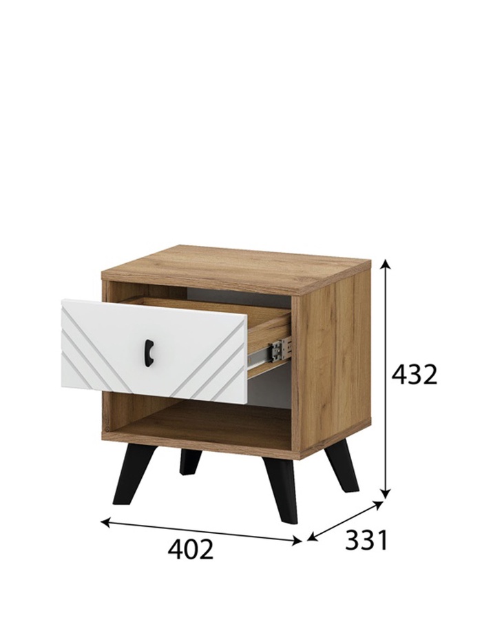 Предназначена для хранения необходимых вещей рядом со спальным местом. Конструкция сочетает выдвижной ящик и открытую полку, что позволяет удобно размещать аксессуары и предметы ежедневного использования. Модель выполнена в двухцветном оформлении с декоративной фрезеровкой фасада.