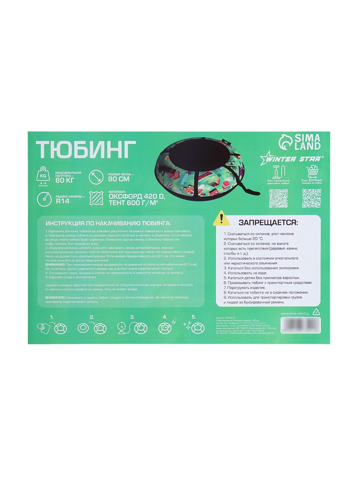 Требования по безопасности: запрещается кататься с трамплинов, по поверхностям с камнями или препятствиями, привязывать тюбинг к транспортным средствам, использовать его на других покрытиях, кроме снежных. Не предназначен для детей младше 3 лет.