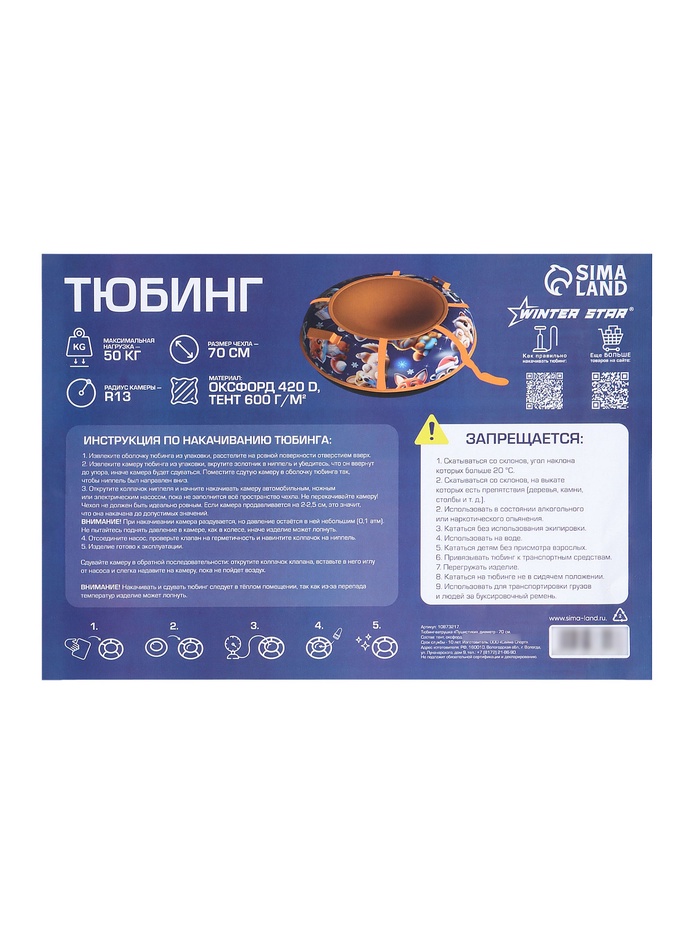 Требования по безопасности: запрещается кататься с трамплинов, по поверхностям с камнями или препятствиями, привязывать тюбинг к транспортным средствам, использовать его на других покрытиях, кроме снежных. Не предназначен для детей младше 3 лет.