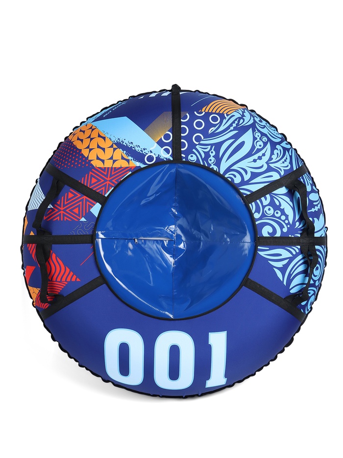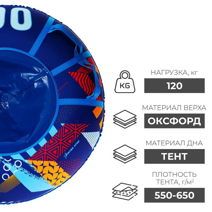 Дно тюбинга изготовлено из тентовой ткани плотностью 550–650 г/м², что гарантирует долгий срок службы и обеспечивает отличное скольжение. Снаряд оснащён безопасными ручками и молнией для быстрого доступа к камере. Имеет закрытую сердцевину, что исключает попадание снега внутрь. Для тюбинга подойдёт камера 16 дюймов. Предназначен для детей от 12 лет.