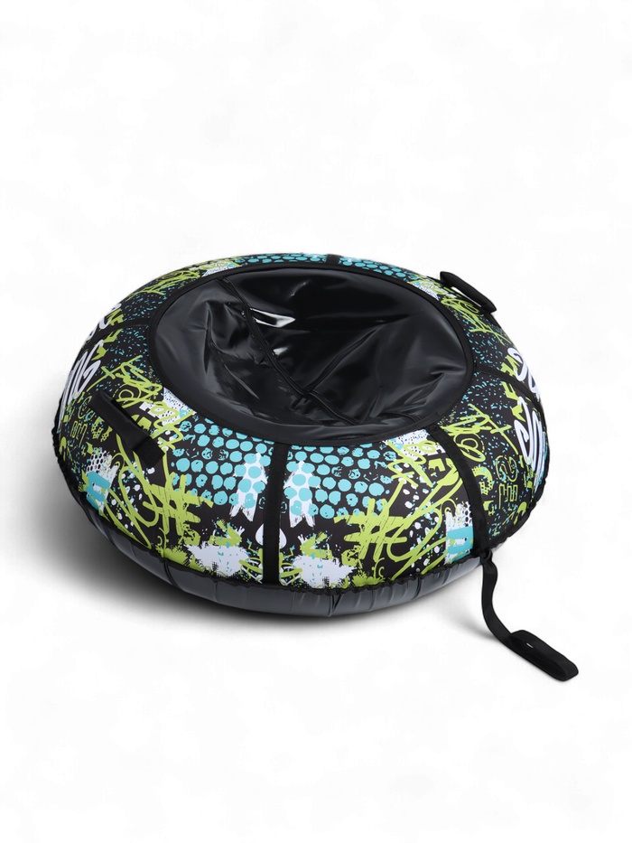 Дно тюбинга изготовлено из тентовой ткани плотностью 600 г/м², что гарантирует долгий срок службы и обеспечивает отличное скольжение. Снаряд оснащён безопасными ручками. Для тюбинга подойдёт камера 16 дюймов. Предназначен для детей от 12 лет.