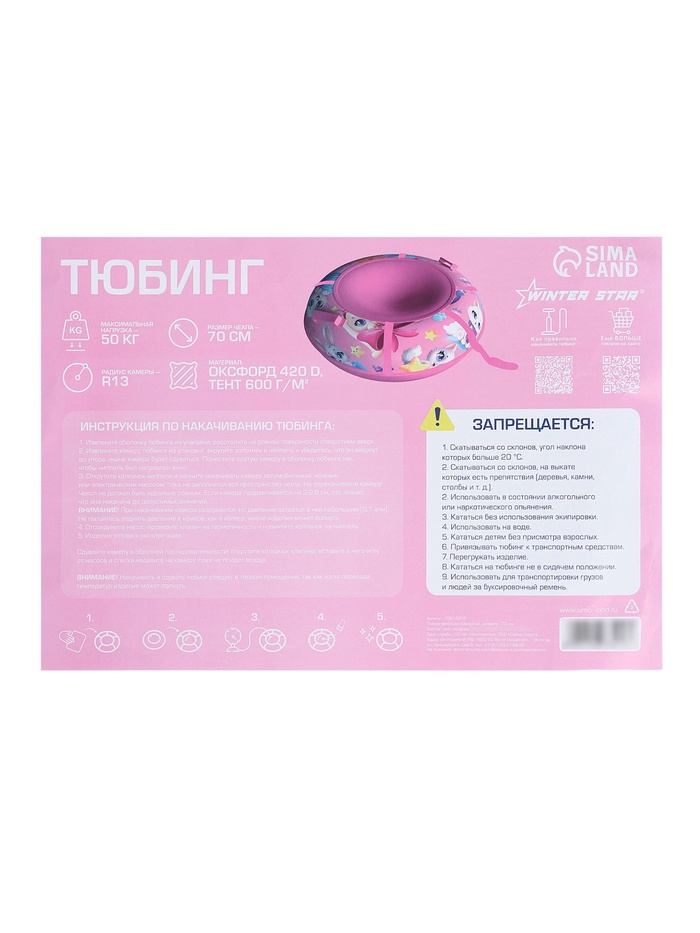 Требования по безопасности: запрещается кататься с трамплинов, по поверхностям с камнями или препятствиями, привязывать тюбинг к транспортным средствам, использовать его на других покрытиях, кроме снежных. Не предназначен для детей младше 3 лет.