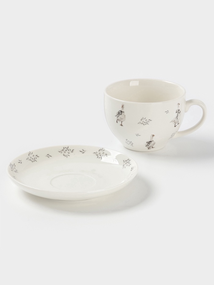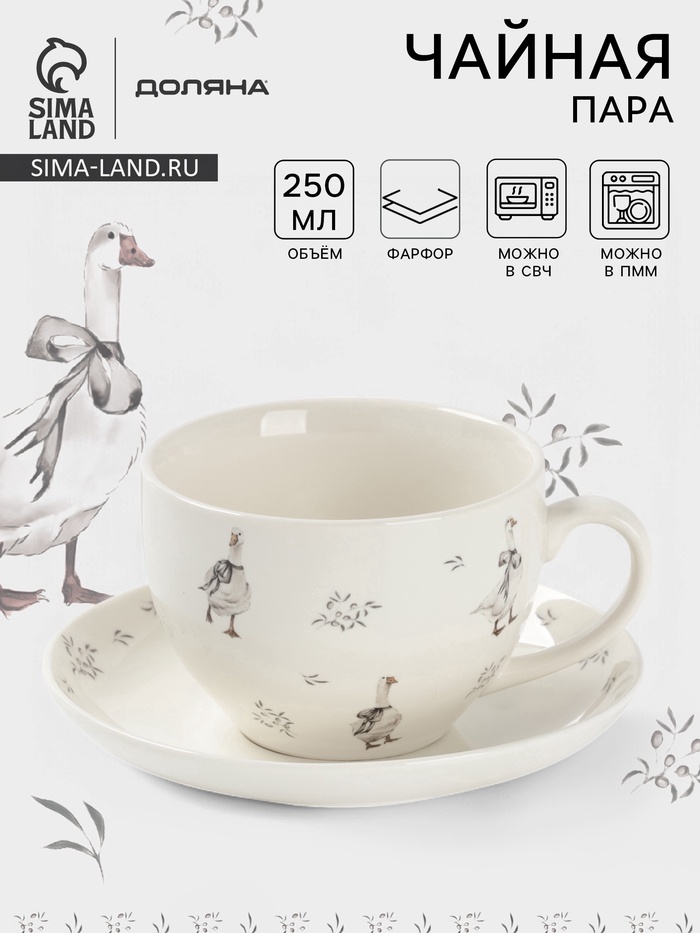 Очаровательная чайная пара из тонкого костяного фарфора, украшенная милым рисунком с гусями. В комплекте: чашка объемом 250 мл и блюдце диаметром 15 см. Создаст атмосферу тепла и уюта во время чаепития. Подходит для использования в микроволновой печи и посудомоечной машине.