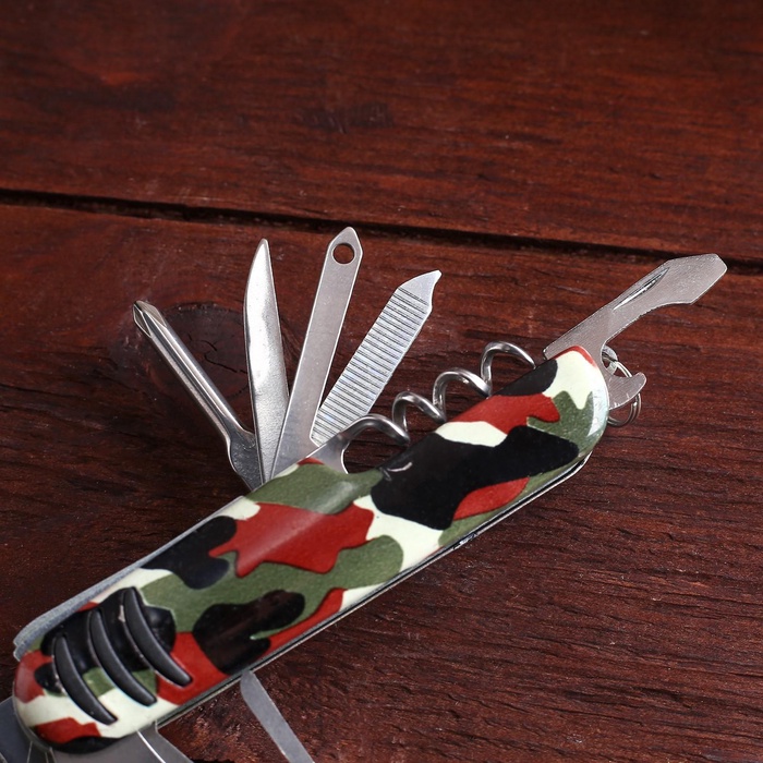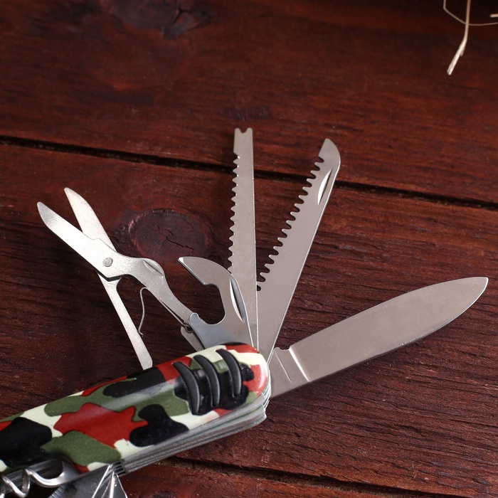УЦЕНКА Нож швейцарский Камуфляж 12 в 1 можно охарактеризовать двумя словами – удобный и функциональный. Такой перочинный нож станет для вас незаменимым помощником, например, дома, в паходе или на пикнике. Потому что вы будете обладать арсеналом самых необходимых инструментов. С их помощью непростая ситуация разрешится в два счета.