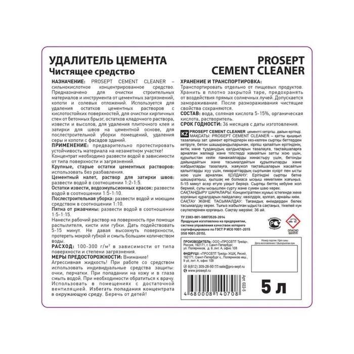 Удалитель цемента Prosept – сильнокислое концентрированное моющее средство, которое эффективно очищает строительный материал и инструменты от цементных загрязнений, копоти и солевых отложений.