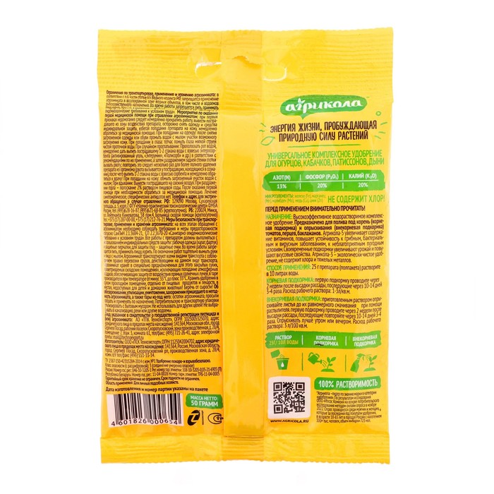 50 г хватает на 20 л рабочего раствора, для обработки 40-50 кв.м посевов.