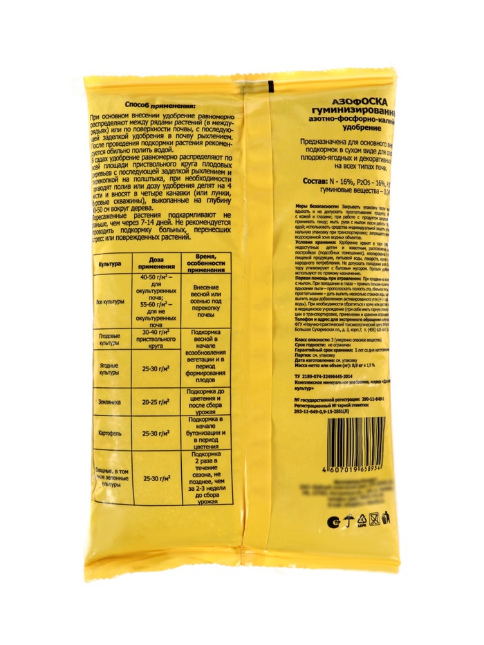 Сложное азотно-фосфорно-калийное удобрение - NPK. Применяется для основного, предпосевного и местного внесения в рядки при посеве, а также для подкормки растений на всех типах почв и под все сельскохозяйственные культуры. Не слеживается, обладает 100% рассыпчатостью, не гигроскопична. Нитроаммофоску вносят в качестве основного и припосевного удобрения на всех типах почв под все сельскохозяйственные культуры. Очень высокая агрохимическая и экономическая эффективность прослеживается при условиях прикорневой подкормки растений локально- ленточным способом на глубину 8-10 см. Наиболее эффективны эти удобрения на черноземах и почвах тяжелого гранулометрического состава. Благодаря разнообразию выпускаемых марок нитроаммофоски удобрение может быть подобрано индивидуально, с учетом особенностей типа почвы и выращиваемой культуры.