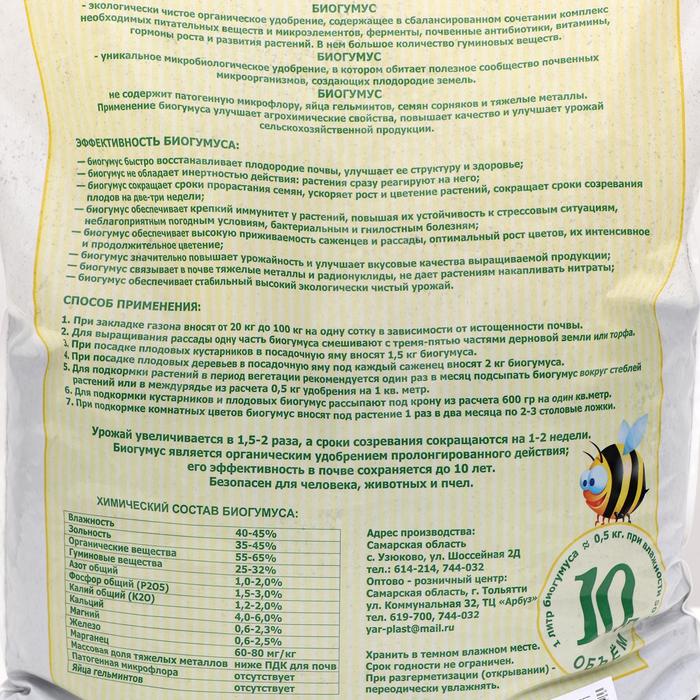 Объем удобрения БиоГумус – 10 литров, что позволяет использовать его на больших участках земли. Это экономичное решение для тех, кто заботится о своих растениях и хочет получить от них максимальный урожай.