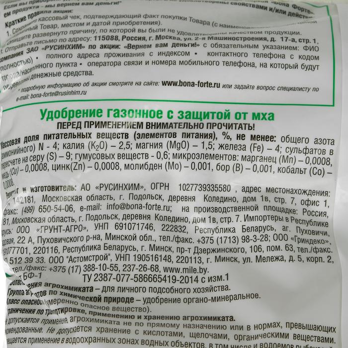 Комплексное средство создано лабораториями Bona Forte для применения на ослабленных мхом газонах.