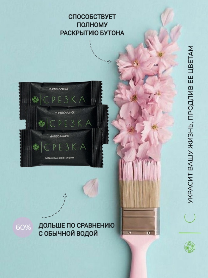 - Порционная упаковка: Один пакетик рассчитан на стандартную вазу. Не нужно отмерять — просто развести в воде и поставить букет.