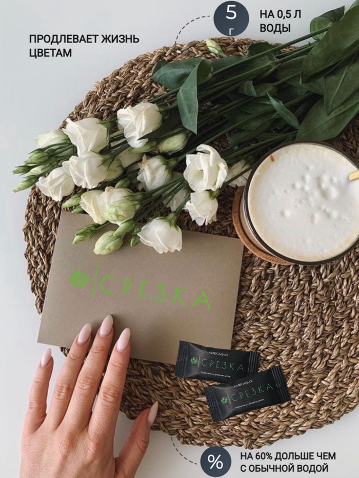 Как использовать: Растворите содержимое в воде, поместите в раствор свежесрезанные цветы. Обновляйте воду каждые 2–3 дня.
