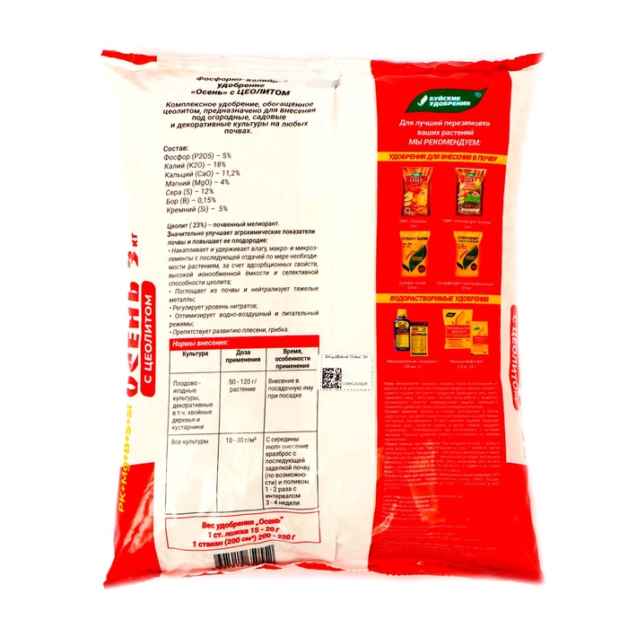 Комплексное минеральное удобрение. Назначение: фосфорно-калийное удобрение предназначено для внесения под огородные, садовые и декоративные культуры. Эффективно использовать осенью при перекопке почвы, при закладке посадочных ям, для подкормок в период плодоношения и в конце вегетации. Доза применения препарата: 35-60 г на 1 м2 - при осенней обработке почвы, 35-60 г на 1 м2 - совместно с азотными удобрениями - при весенней обработке почвы. Время, особенности применения: 1 столовая ложка вмещает 20 г удобрения. Состав: P2O5 (%): 5; K2O (%): 18; CaO (%): 8; MgO (%): 2.5; S (%): 12. Микроэлементы: В - 0.15.