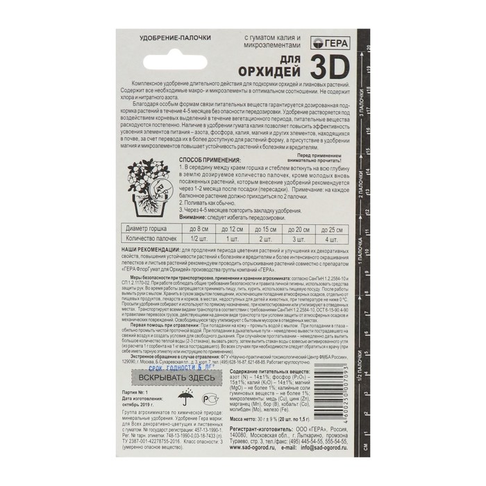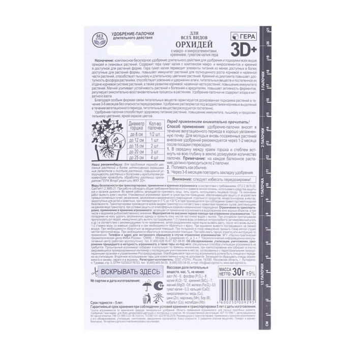 Удобрение Гера 3D для орхидей, выполненное в виде палочек, обеспечивает длительное действие. Оно предназначено для подкормки орхидей и лиановых растений.