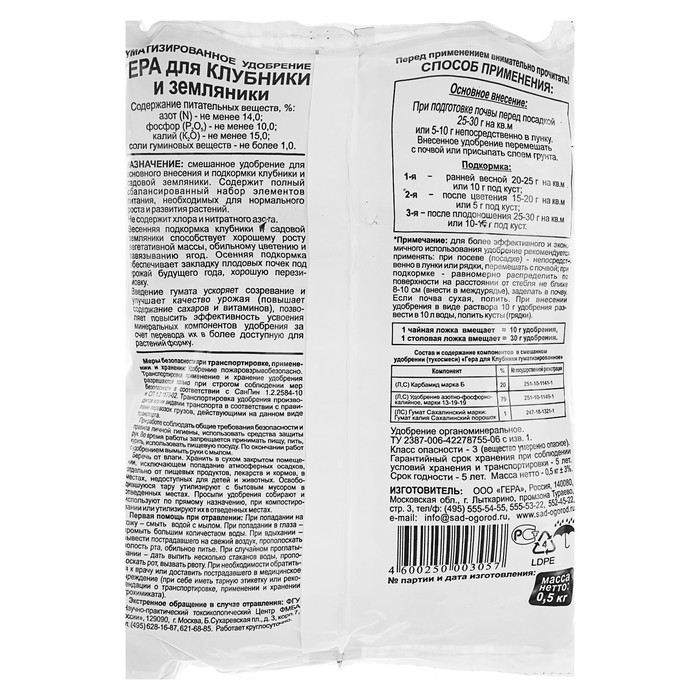 Гуматизированный агрохимикат «ГЕРА» — это смешанное удобрение для основного внесения и подкормки клубники и садовой земляники.