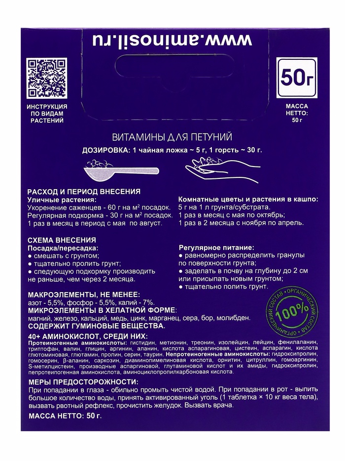 Улучшение цветения: Аминосиловые гранулы стимулируют обильное и продолжительное цветение, радующий глаз яркими красками весь сезон. Ваши петунии превратятся в настоящий оазис на вашем участке, дразня окружающих своей красотой и силой. Подарите своим растениям новый уровень ухода – подчеркните их природную красоту, стоит лишь раз попробовать!