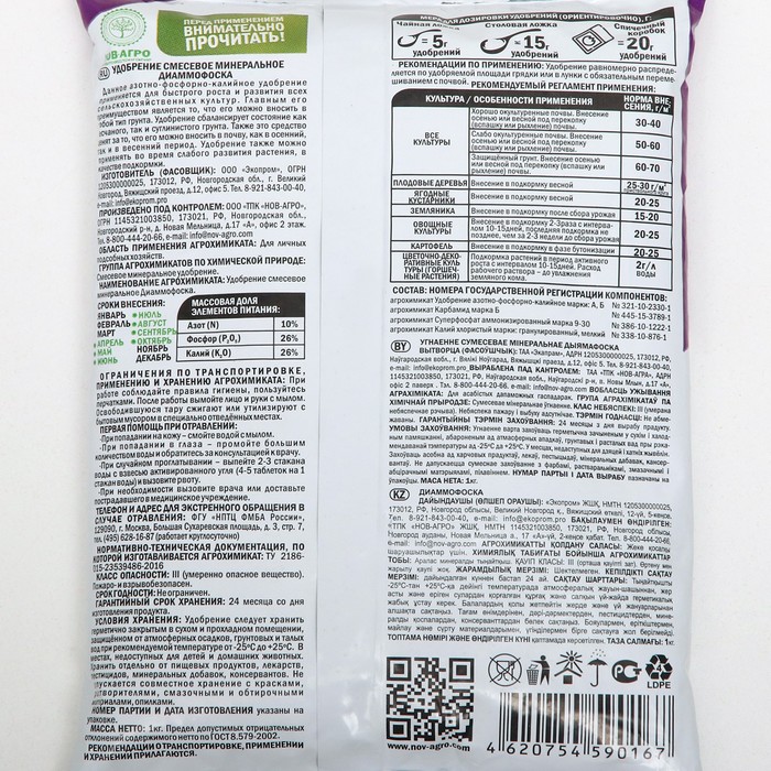 Его применение особенно выгодно в почвенных зонах с низким содержанием подвижного фосфора и калия, где отзывчивость культурных растений на диаммофоску выше, чем на плодородных почвах.