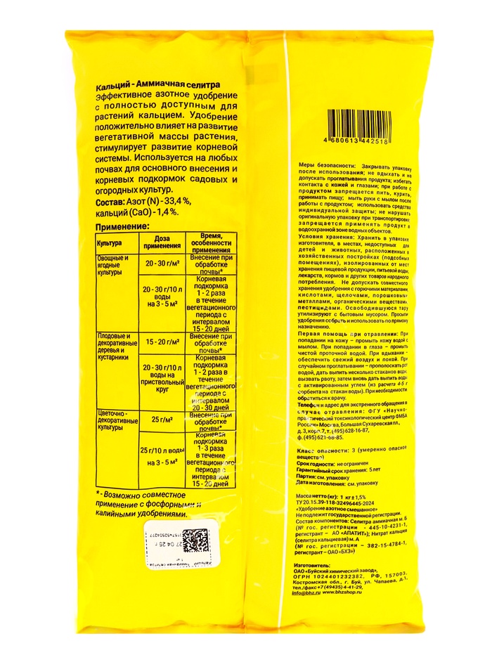 Эффективное азотное удобрение с полностью доступным для растений кальцием. Рекомендуется для различных садовых, огородных и цветочно-декоративных культур в период от начала вегетации до периода их активного роста.