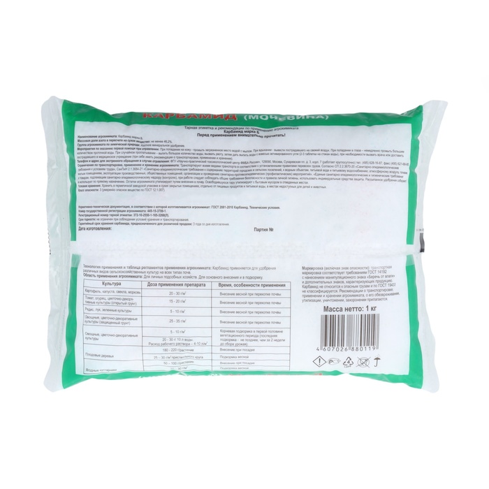 Удобрение минеральное Карбамид (мочевина), 1 кг хорошо повлияет на развитие ваших растений. Благодаря такой помощи любой кустарник, корнеплод или цветок будет сильным, здоровым, а урожай — великолепным.