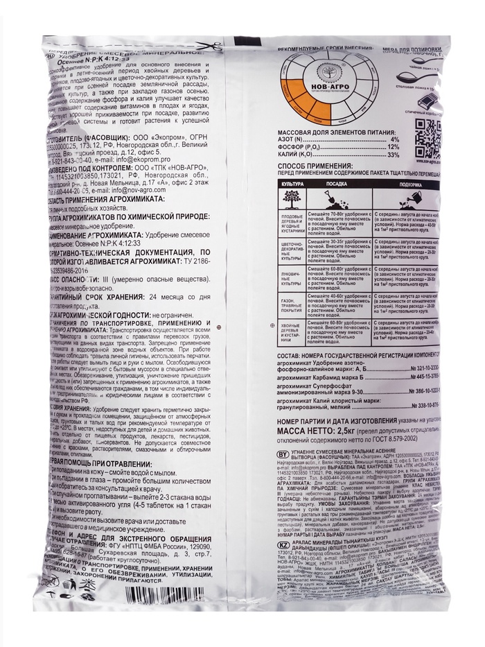 Высокоэффективное «Осеннее» комплексное удобрение с микроэлементами» специально разработано для применения на садовых, огородных и приусадебных участках в летне-осенний период. Используется для основного внесения под осеннюю перекопку и при осенней посадке луковичных культур, земляничной рассады, плодово-ягодных, а также хвойных деревьев и кустарников. Благодаря наличию комплекса микроэлементов и повышенному содержанию калия и фосфора повышает иммунитет и улучшает холодо- и морозостойкость растений.