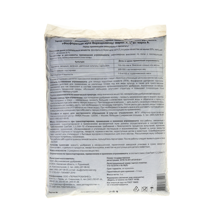 - эффективное минеральное удобрение, которое кроме основного элемента питания фосфора (Р2О5 не менее 17%), содержит кальций (до 33%), серу, магний, кремний и широкий спектр микроэлементов: Fе, Сu, В, Мп, Мо, Zn, Со, причем содержание микроэлементов в фосфоритной муке адекватно их среднему нормальному уровню концентраций в почвах. В фосфоритной муке содержится более 11 элементов, необходимых для питания растений;