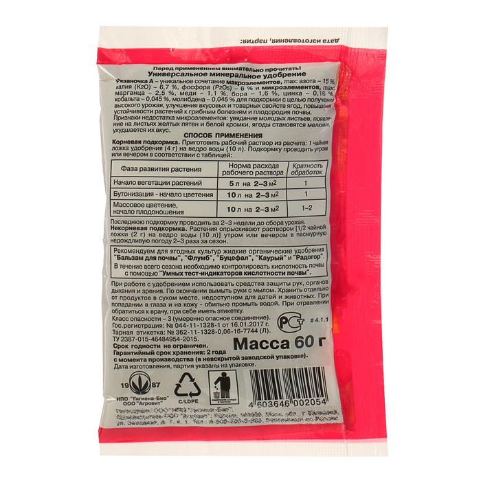Комплексное водорастворимое удобрение для подкормки с целью получения высокого урожая, улучшения вкусовых и внешних свойств, повышения устойчивости растений к грибным болезням и плодородия почвы ягодных культур.