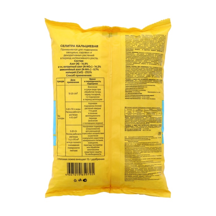 «Селитра кальциевая» — это комплексное минеральное удобрение для подкормок овощных, плодовых, цветочных и декоративных культур. В его состав входят кальций (27 %) и азот (14,9 %). Средство представляет собой полусферические гранулы белого и желтоватого цвета.