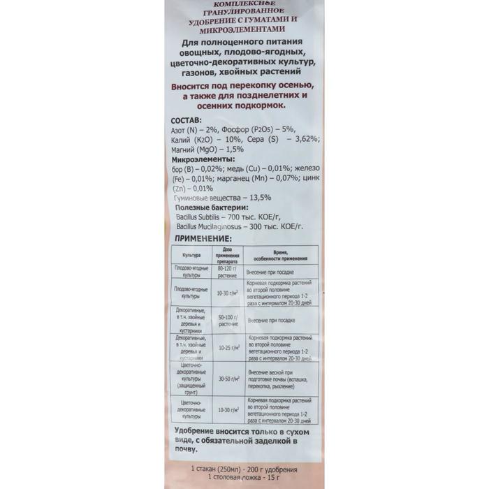 Комплексное гранулированное органоминеральное удобрение "Осеннее". Назначение: Сбалансированный состав и соотношение по макро- и микроэлементам способствует росту и закладке плодовых почек, ускорению прохождения ростовых процессов, накоплению запасов питательных веществ, росту всасывающей части корневой системы многолетних садовых и декоративных культур, кустарников, плодовых деревьев. Преимущества: комплексное, сбалансированное (под разные культуры), гранулированное (пролонгированного действия), не содержит хлор. ОМУ - комплексное гранулированное удобрение пролонгированного действия, производится на основе низинного торфа, в состав которого входят гуминовые вещества, макро- и микроэлементы. ОМУ работает ранней весной, когда растениям необходима стимуляция роста, летом - в период активной вегетации и осенью, укрепляя растения на зиму благодаря его пролонгированному действию. В процессе производства ОМУ минеральные элементы питания закрепляются в органической грануле. Более подвижные азот и калий не вымываются поливными водами из гранулы, как это происходит с минеральными удобрениями, а фосфор не образует нерастворимых соединений в почвенном растворе. Органоминеральная гранула – это микрокладовая питательных элементов для растений. За счет этого коэффициент использования питательных элементов, содержащихся в ОМУ, в 1,5 раза выше по сравнению с минеральными удобрениями, где усваивается максимум 25–30% питательных веществ, в то время как процент усвоения ОМУ составляет 80-90%. Оптимальное соотношение элементов питания предохраняет от избыточного накопления нитратов в продуктах; повышает морозоустойчивость и сопротивляемость растений болезням; рыхлость почвы и ее водопроницаемость; обеспечивает не только прирост урожая, но и улучшает питательную ценность продукции. Органоминеральная оболочка защищает растения от избыточного повышения солевой концентрации почвенного раствора в зоне развития корневой системы растений. Такие свойства делают это удобрение эффективным, в том числе, и стартовым удобрением для многих культур.